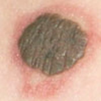 This darkly pigmented lesion on the left arm of a 27-year-old man had been present since birth and had slowly enlarged over the past 2 months. Two days earlier, another physician had diagnosed a wart and treated the lesion with liquid nitrogen, which caused erythema of the surrounding skin.