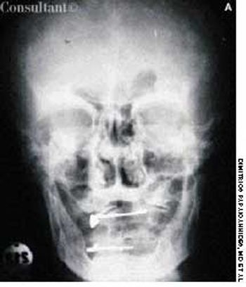 A 74-year-old man, who had been aware of a gradual increase in hat size over the past 3 years, complained of a mild headache and backache. His serum phosphatase level was 1,475 U/L (upper normal limit, 120 U/L). Skull films showed calvarial enlargement caused by thickening of the cortical tables, radiolucency in the frontal and occipital regions, and patchy osteosclerosis that produced a cotton-wool appearance.
