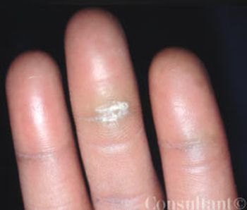 A 38-year-old African American man presented with a 10-year history of a solitary “wart” that had not responded to over-the-counter acid treatments. No other lesions were noted on the patient. Based on the clinical appearance, punctate porokeratosis was diagnosed.