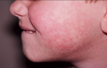 From lacy and reticular and limited to the cheeks, this rash quickly covered the child’s body and transformed into a solid rash. Your dx?