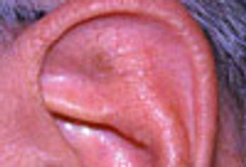 Skin lesions in the outer ear-the pinna, the concha, and the external auditory meatus-may be trivial or potentially malignant. Here we consider a flesh-colored swelling with a central white spicule; a tan papillary lesion; a fluctuant swelling; a red berry-like papule; an elevated pink lesion.