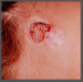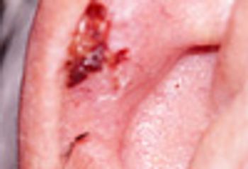 This rounded 0.5-cm ulcerated lesion with a slightly raised border between the helix and the antihelix had been present on an 85-year-old man’s ear for an unknown period.