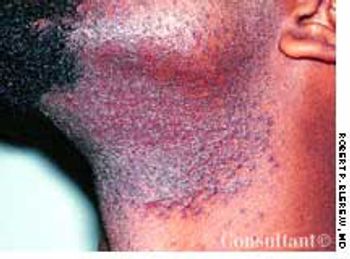 The rash on the neck of this 24-year-old man first appeared when he began to shave as a teenager. Pseudofolliculitis barbae affects 50% to 75% of black persons and 3% to 5% of white persons who shave.