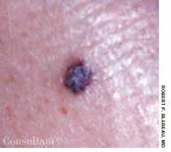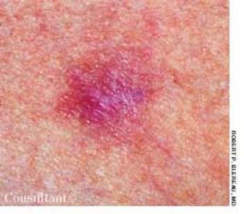 A 65-year-old man had had an asymptomatic lesion on his left lateral lower leg for several weeks. The dark maroon, almost black, 3- to 4-mm, circular, elevated lesion had a convoluted surface of dilated vessels.