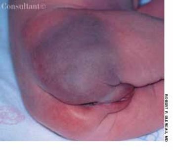This photo was taken minutes after the birth of a female newborn and reveals a purple discoloration of the right buttock.