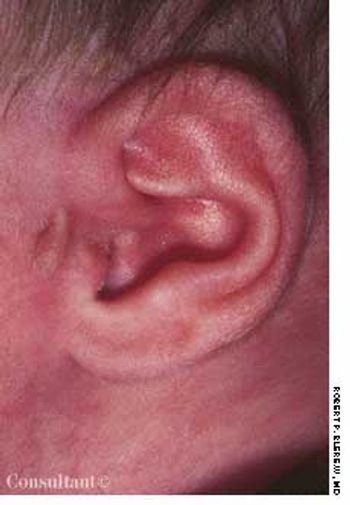 The left ear of a 1-month-old infant girl shows a congenital papillomatous lesion at the preauricular area. She had no other apparent abnormalities.