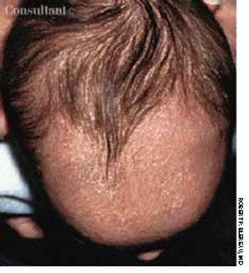 The entire scalp of this 1-month-old boy shows the diffuse yellow scaling of seborrheic dermatitis. Called “cradle cap” in infants, this dermatitis typically begins on the scalp during the first 3 months and may spread over the entire face. An associated stubborn diaper rash may develop in some infants.