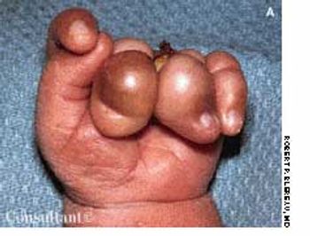 These photos are of the left hand of a full-term, newborn infant with focal ring constrictions of the third, fourth, and fifth fingers; secondary edema and discoloration are also seen.