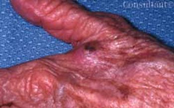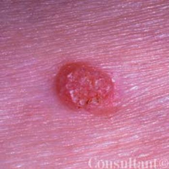 An 87-year-old woman sought treatment of what she described as a “bite” of 1 month’s duration. The pink, nodular lesion on the dorsum of the left hand had central superficial ulceration with yellow crusting at the web space between the thumb and index finger.