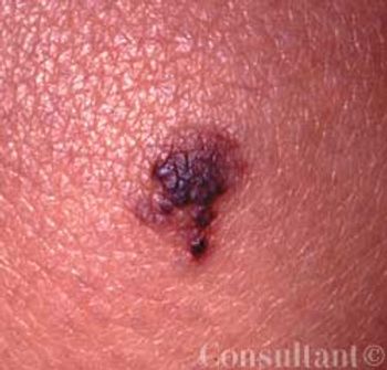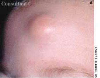 A 0.5-cm mass with overlying erythema on the forehead of a 5-monthold girl was first noticed after she had been hit on the head with a rattle. Excision of the mass was deferred because it was considered to be a hemangioma.