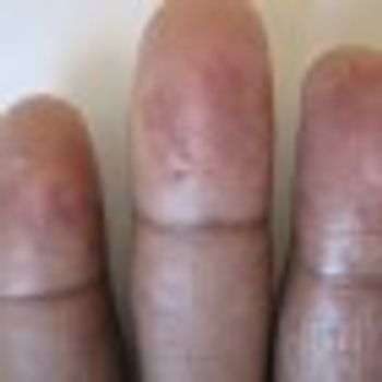 The young female presented with a 1-month history of violaceous papules, petechiae, and healing ulcerations on the distal digits of both hands and feet.