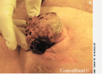 A 38-year-old man presented with a fleshy lesion beneath the tip of his penis. He had discovered it about 18 months before the initial evaluation. A second similar lesion resembling a “cauliflower” had appeared several weeks after the first. Both lesions had grown and had begun to bleed during intercourse.