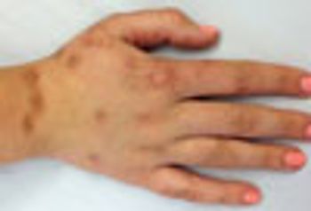 The persistent pigmentation on this woman’s hands corresponds to areas of intralesional injections of bleomycin for recalcitrant warts.