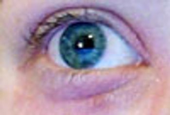 Contact dermatitis to paste-on fingernail decorations developed when the patient held her lower eyelid down with her index finger to insert her contact lenses.
