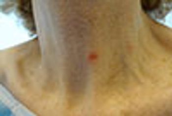 The red patch on this woman's neck is lichenoid keratosis, a variant of seborrheic keratosis. Diagnostic contenders included Bowen disease and superficial basal cell carcinoma.