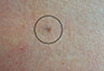 This pigmented macule clearly stands out against a bland background of fair-complected skin. This is known as the “ugly duckling” sign. Such lesions should always be viewed with suspicion and a biopsy is generally indicated.