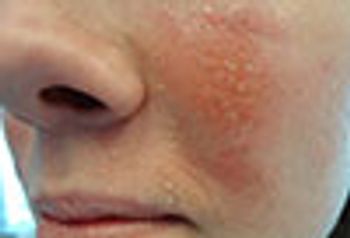 This is a prototypical case of acute contact dermatitis to benzoyl peroxide that the patient had been applying for her mild to moderate papulo-pustular acne. Twice-daily application of hydrocortisone 2.5% cream led to prompt resolution of the rash.