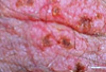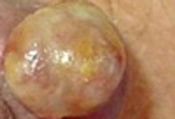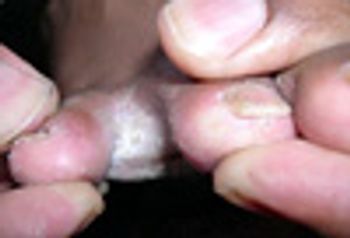 This teen sought care because of extremely pruritic nodules on the penis and scrotum. He also had mild itching on the wrists and between several finger webs. This distribution of a pruritic dermatosis is classic for scabies.