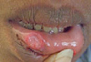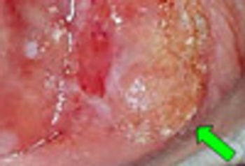 There is a rather large erythematous patch/plaque present. However, an exophytic, verrucous nodule is visible at the inferior border of the tumor. Biopsy of the flatter portion of this lesion disclosed squamous cell carcinoma in-situ, while biopsy of the nodule revealed invasive squamous cell carcinoma.