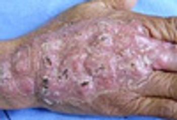 A 61-year-old obese, man with type 2 diabetes presented with the gradual onset of a mildly tender lesion on the dorsum of the right arm.
