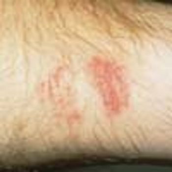 While doing yard work, a man experienced acute, severe, burning pain on relatively brief contact with the caterpillar Megalopyge opercularis. The lesion shown in the photograph developed subsequently. Each red papule represents the site of direct cutaneous envenomation by the insect's poisonous body hairs. The caterpillar can vary in color from white to dark brown, depending on the surroundings and time of year. The fuzzy hairs resemble a cat’s fur; hence the nickname “puss.”