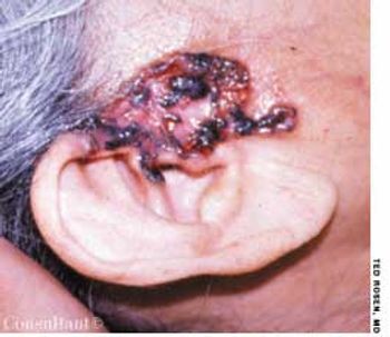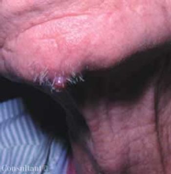 he sudden appearance of an asymptomatic, 6 x 4.5-mm, exophytic, red nodule on the chin prompted an ostensibly healthy 73-year-old nonsmoker to seek medical attention. His nodes were not enlarged, and he had no other skin lesions.