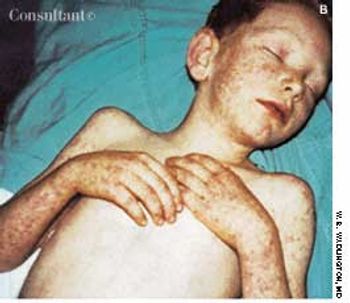 Rickettsia rickettsii is transmitted tohumans by a tick bite. This boy hadbeen camping a short time beforea fever and the classic rash of RockyMountain spotted fever developed.The erythematous macular rashfirst appears on wrists and anklesand spreads to the trunk. Note thepuffy appearance of the skin resultingfrom vasculitis.
