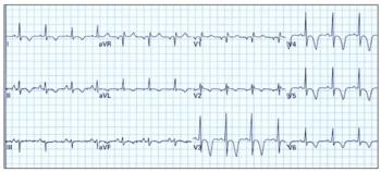 Can you discern the anomaly in this patient's ECG? What clue(s) does it provide to the underlying pathology?