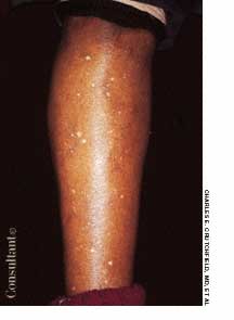 After more than 15 years of wondering what the “white specks” on his legs were, a 64-year-old man consulted his physician. The patient was taking medication to control hypertension; he was otherwise healthy.