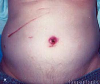 A 78-year-old man with a history of asthma, coronary artery disease, chronic obstructive pulmonary disease (COPD), and recently diagnosed prostate cancer was admitted to the medical ICU with exacerbation of COPD. The obtunded patient was unable to provide a history. A 4 × 6-cm firm nodule of unknown duration was noted over the right upper quadrant of the patient’s abdomen. There were no other cutaneous lesions.