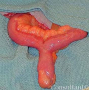 During surgical resection for colon cancer, an 8.5-cm diverticulum was found incidentally in a 70-year-old man. The lesion arose from the antimesenteric surface of the terminal ileum; it was located about 2 ft proximal to the ileocecal junction. Palpation of the diverticulum revealed a hard mass at its tip and a thickened wall at its base.