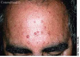 A 65-year-old woman, who was confined to a wheelchair because of severe rheumatoid arthritis, was concerned about nodules that had erupted on her fingers and hands during the previous 3 weeks. Her medical history included colon cancer, chronic renal insufficiency, anemia, and hypertension. The nonpruritic nodules were painful when they began to form under the skin; however, once they erupted, the pain disappeared.