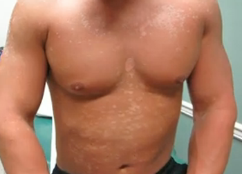These discolored, scaly lesions on this young man’s trunk have recurred for the past 2 summers. He reports that the rash becomes “irritated and itchy” when he is in the sun.