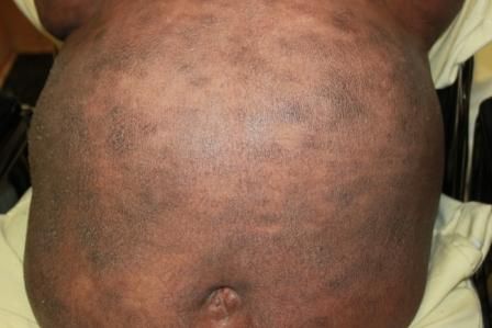 Tinea versicolor presents with hyperpigmented and hypopigmented coalescing thin scaly plaques and macules.Typically they appear on the trunk and the upper back. It is more common in warm humid climates.