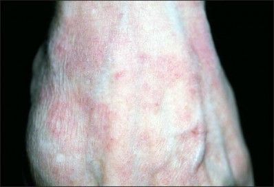 Round plaques like this one, each composed of many small erythematous papules, are classic for granuloma annulare. Large numbers of these lesions and widespread distribution is often associated with diabetes mellitus.