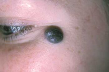 This pigmented macule clearly stands out against a bland background of fair-complected skin. This is known as the “ugly duckling” sign. Such lesions should always be viewed with suspicion and a biopsy is generally indicated.