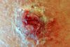 This lesion looks like basal cell or squamous cell carcinoma, but biopsy showed it to be an idiopathic inflammatory disorder of the external ear. Skin cancers of the pinna are rarely painful, as this lesion was.