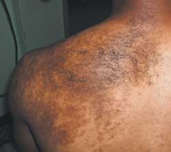 For the past 7 years, a 32-year-old African-American man had multiple nonpruritic scalp abscesses. He also reported intermittent fever and joint pain. The abscesses had been drained on many occasions, and he had received several antibiotics, although no organisms had been isolated. Collagen vascular disease, SAPHO syndrome (synovitis, acne, pustulosis, hyperostosis, osteitis), discoid lupus, and cutaneous sarcoid had been ruled out. During the past 7 years, he had been treated with prednisone, methotrexate, and hydroxychloroquine without any response.