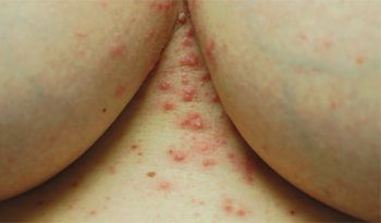 For 1 month, a 54-year-old woman has had an intensely pruritic eruption on her abdomen, arms, and anterior thighs. She has long-standing hypertension and type 2 diabetes mellitus, which are treated with an angiotensin-converting enzyme inhibitor/diuretic and an oral hypoglycemic agent.