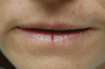 Despite frequent application of lip balm, this split on a 46-year-old woman’s lower lip has failed to heal. What do you suspect?