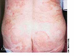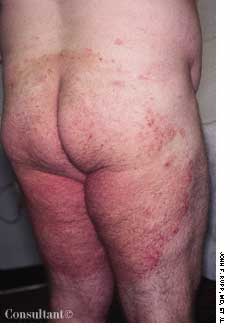 For 6 years, a 32-year-old man had a recurring rash on his back, shoulders, and chest. He stated that the rash appears in the spring, itches, and enlarges into ringlike areas. Previously, when treated with cephalexin, the rash had cleared within several weeks. Antifungal medication (econazole cream and oral terbinafine) had failed to resolve the rash.
