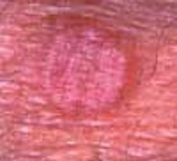 A new lesion recently arose on the right flexor forearm of a 67-year-old man. The 1-cm, pruritic, pink, circular, slightly raised lesion was perfectly homogeneous with no central clearing.