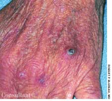 A 75-year-old man complained of the sudden appearance of multiple “moles” on his back. He had no history of skin cancer. Past medical history was significant for prostate cancer, which had been diagnosed and treated 2 years previously.