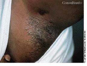 The rash on the neck of this 24-year-old man first appeared when he began to shave as a teenager. Pseudofolliculitis barbae affects 50% to 75% of black persons and 3% to 5% of white persons who shave.