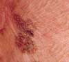 A 60-year-old woman was referred by her gynecologist because of a lesion on the buttocks of which the patient first became aware when she noticed blood on her underwear. Physical examination revealed an irregularly pigmented and slightly eroded asymmetric plaque. Examination with a magnifier highlighted a slightly rolled border, from which a shave biopsy was performed.