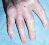 A 53-year-old man presented with a 3-day history of bilateral pain in the lower extremities. He also had a 3-month history of thickening and desquamation of skin, with associated itching, and a 5-lb (2.27-kg) weight loss. The skin changes initially appeared on the hands and subsequently became generalized.
