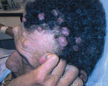 A 65-year-old woman, who was confined to a wheelchairbecause of severe rheumatoid arthritis, was concernedabout nodules that had erupted on her fingers and handsduring the previous 3 weeks (A). Her medical historyincluded colon cancer, chronic renal insufficiency, anemia,and hypertension. The nonpruritic nodules were painfulwhen they began to form under the skin; however, oncethey erupted, the pain disappeared.