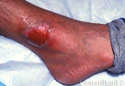 A 45-year-old woman presented with a slowly enlarging, mildly tender lesionon the left sole. The large indurated plaque was studded with multiple firmpapules and nodules that involved the instep and extended onto the medialaspect of the foot. There was no regional adenopathy.