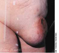 A 65-year-old man had had an asymptomatic lesion on his left lateral lower leg for several weeks. The dark maroon, almost black, 3- to 4-mm, circular, elevated lesion had a convoluted surface of dilated vessels. Dr Robert P. Blereau of Morgan City, La, excised the papule via a punch biopsy; pathologic examination identified an angiokeratoma.