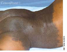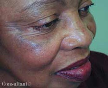 A 58-year-old black woman sought evaluation of areas of increased pigmentation on her cheeks that had been present for many years. Bleaching agents did not lighten the area; new, non–nickel-containing eyeglass frames had no effect. A 3-week course of halobetasol cream failed to fade the hyperpigmentation.
